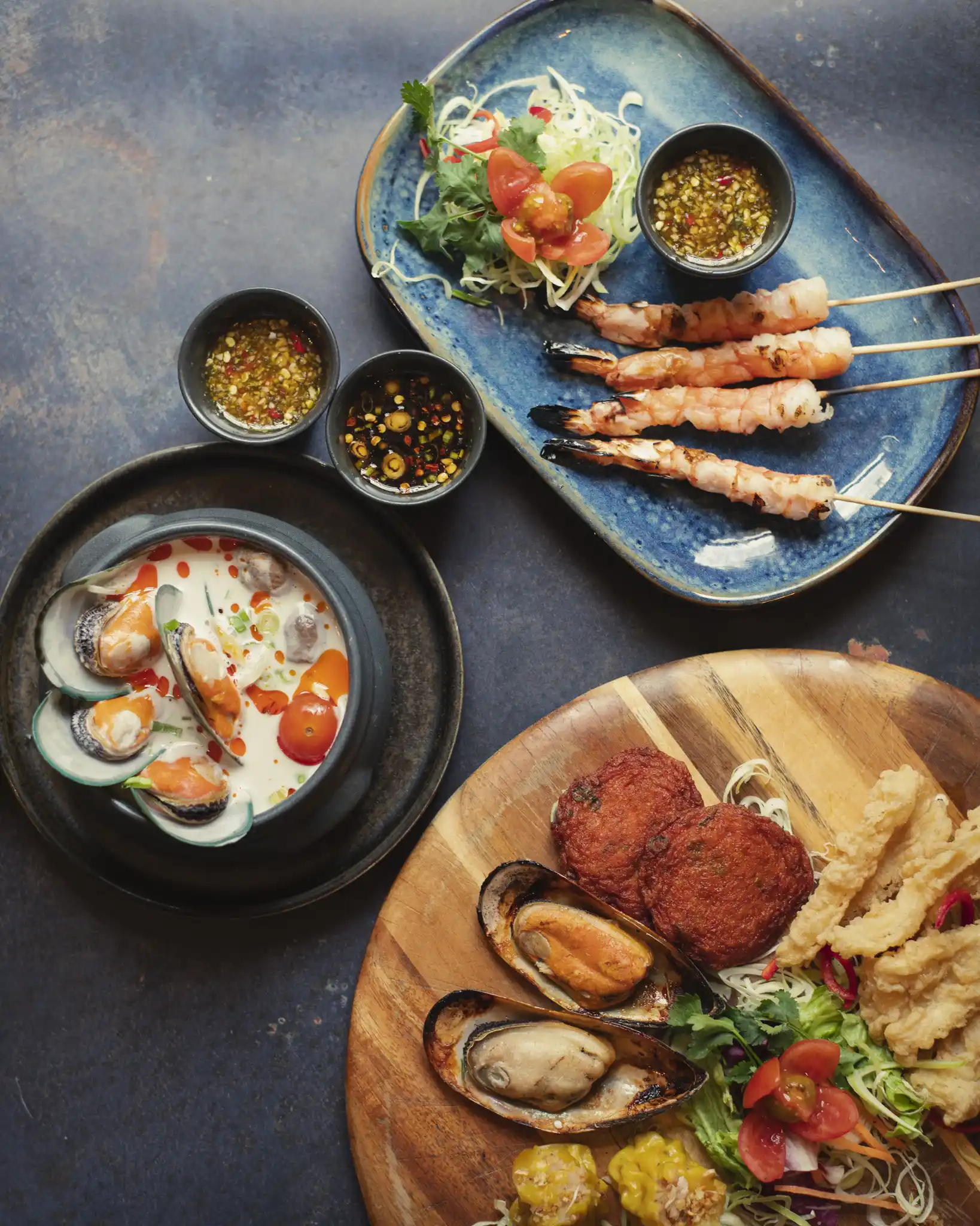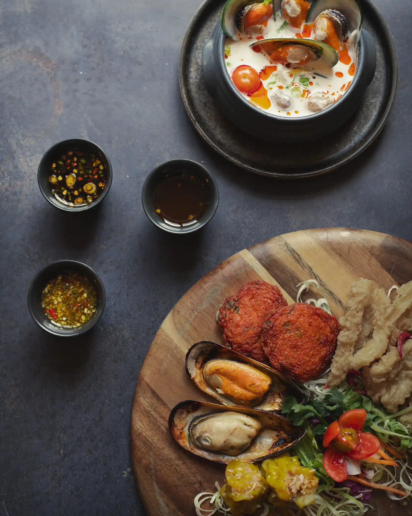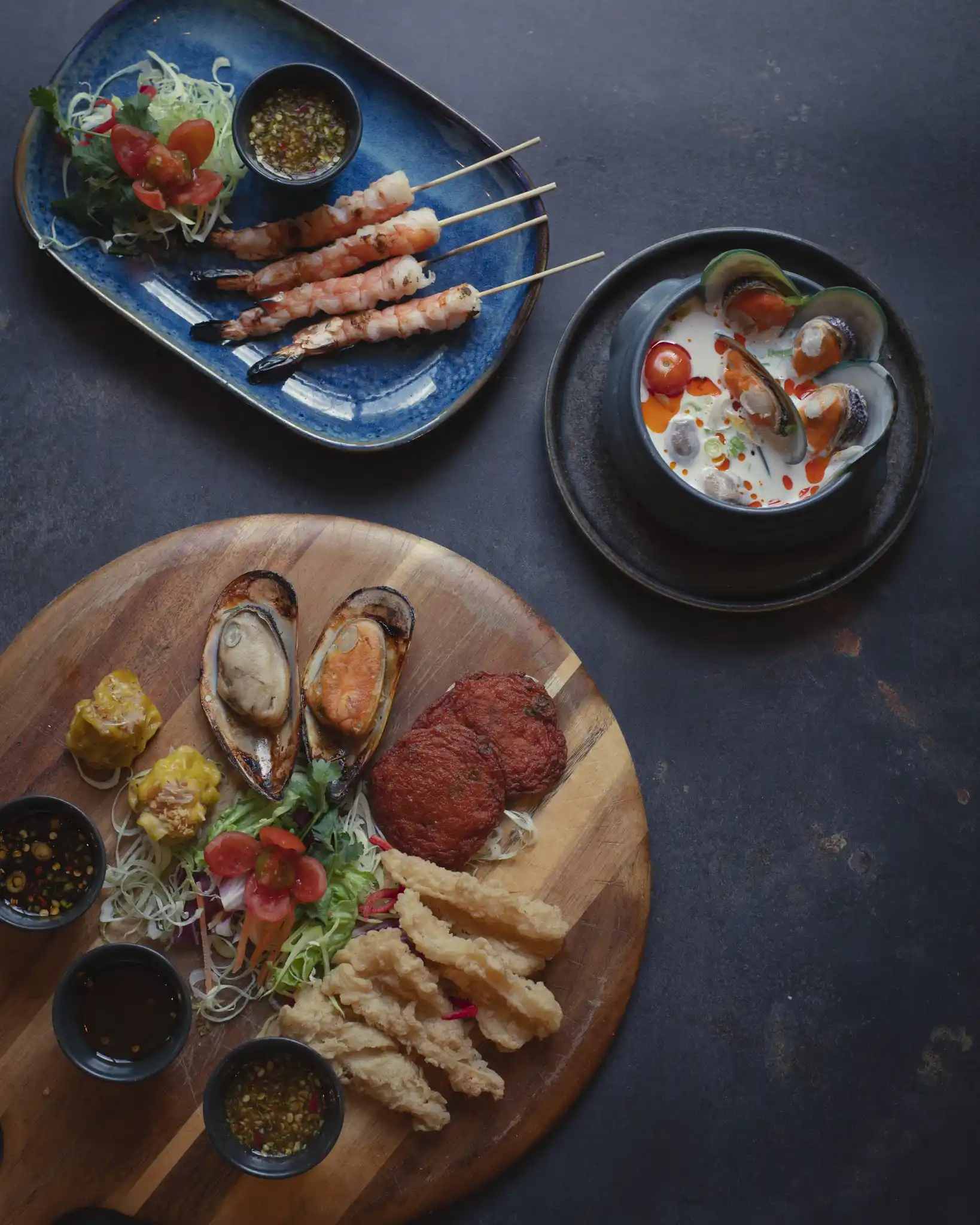 A celebration of all our favourite seafood items on one board? - Yes please! Lightly battered cripsy squid, Thai fishcakes, mussels and perfectly crimped & steamed Dim Sum make this platter almost too good to share!